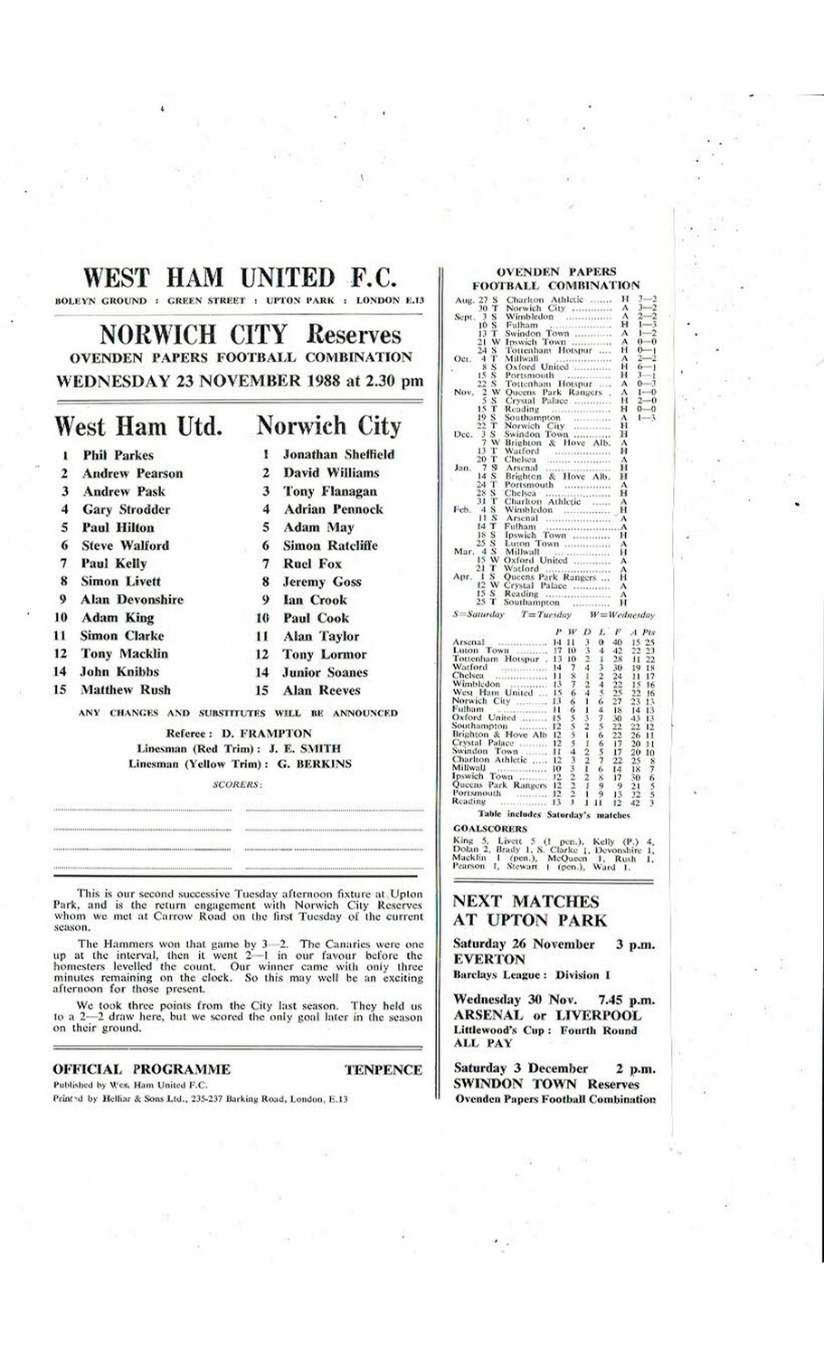 West Ham United v Norwich City Football Combination Programme 1988/89
