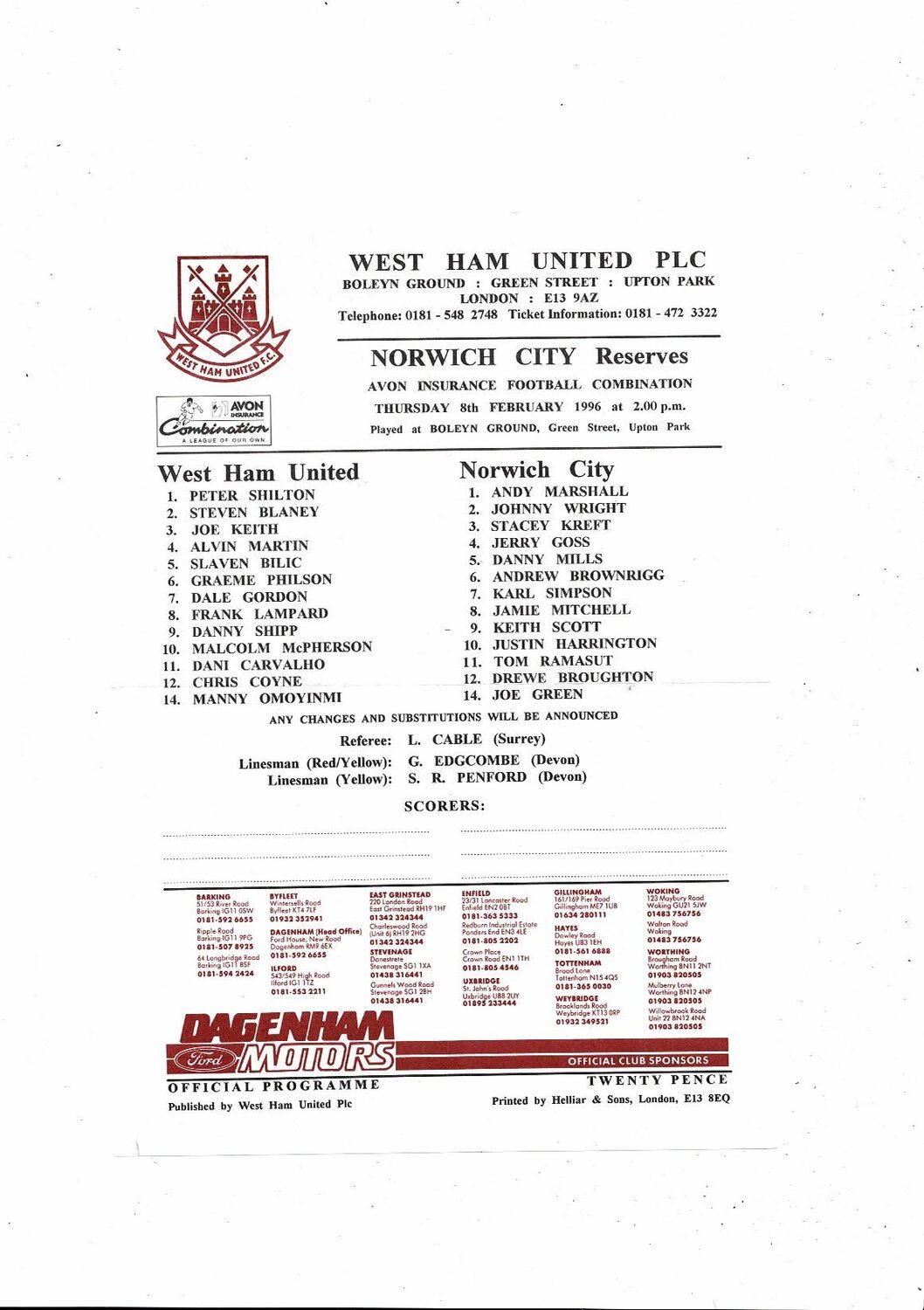 West Ham United v Norwich City Football Combination Programme 1995/96