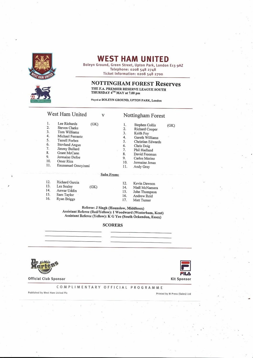 West Ham United v Nottingham Forest Football Combination Programme 1999/00