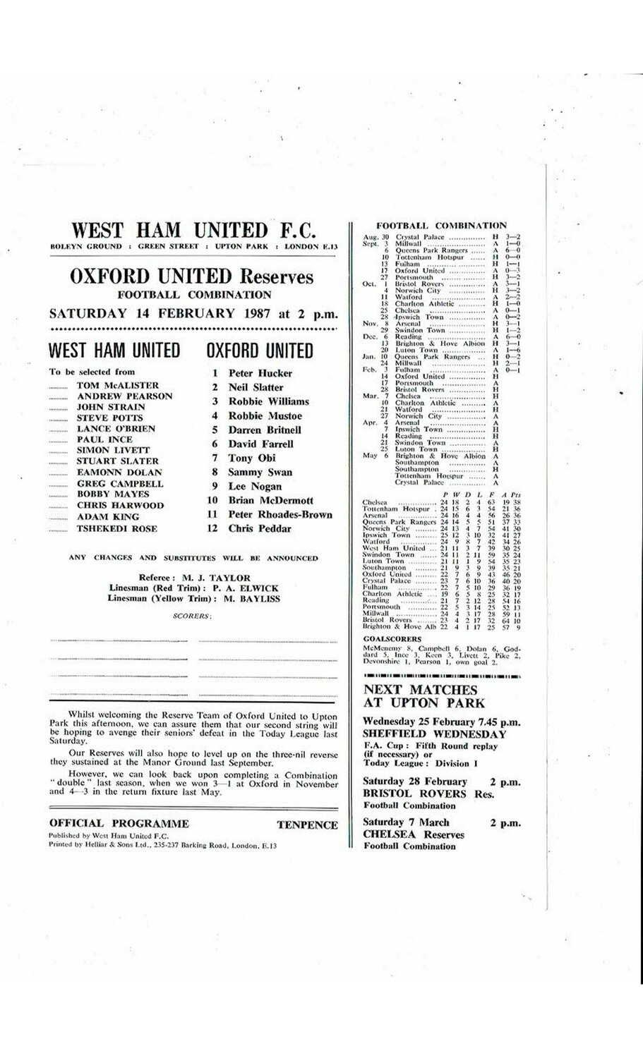 West Ham United v Oxford United Football Combination Programme 1986/87