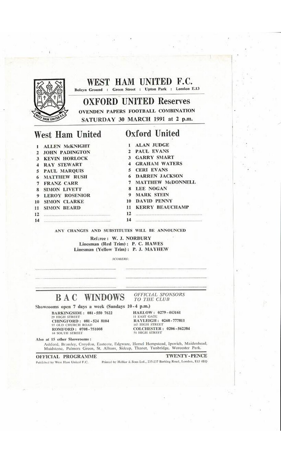 West Ham United v Oxford United Football Combination Programme 1990/91