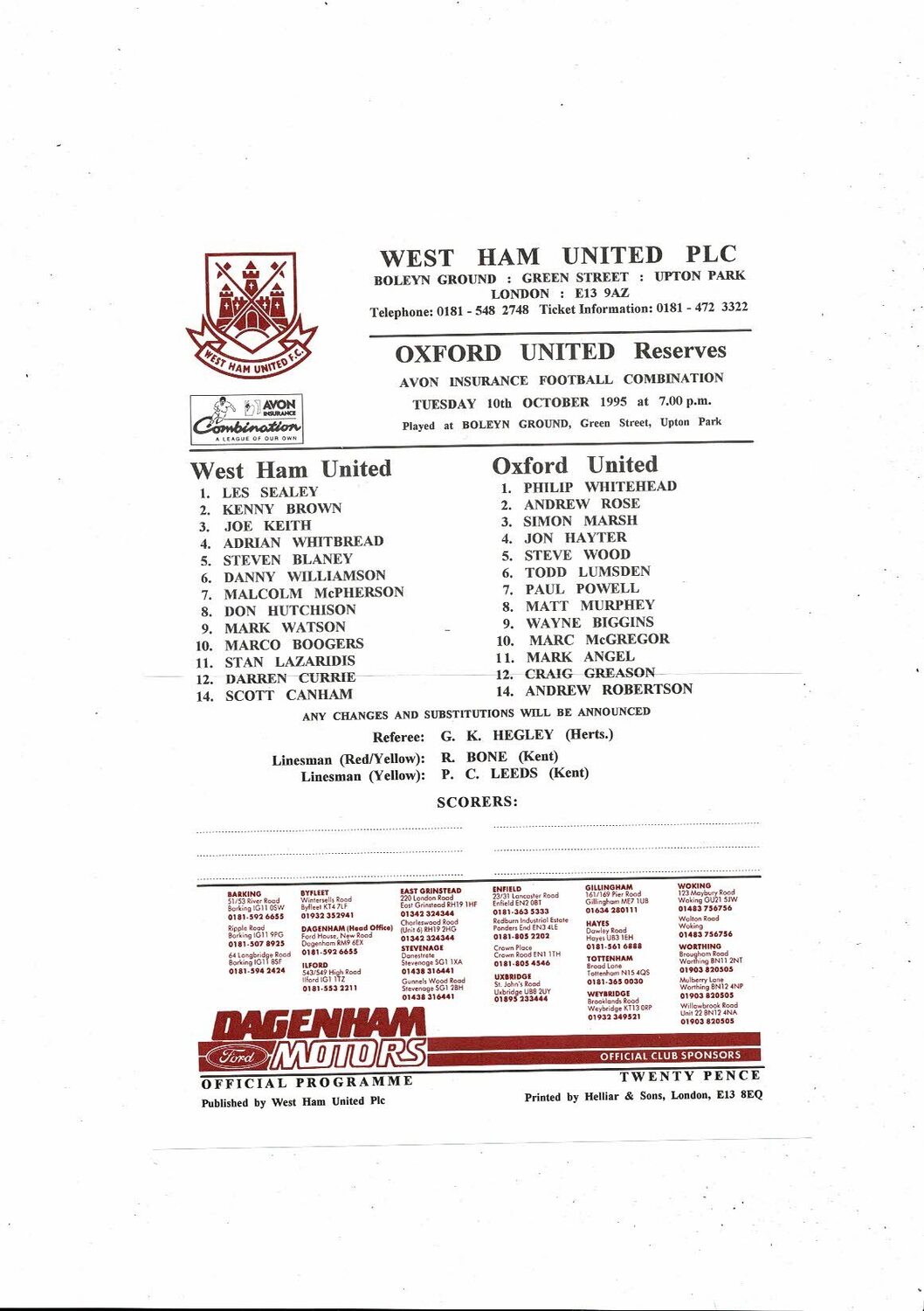 West Ham United v Oxford United Football Combination Programme 1995/96