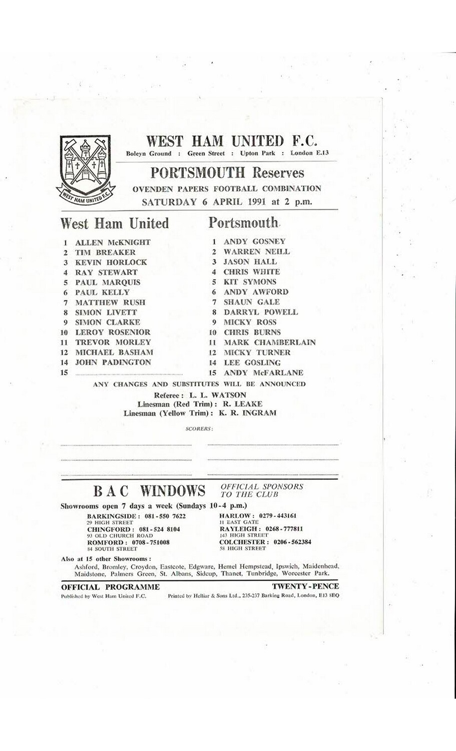 West Ham United v Portsmouth Football Combination Programme 1990/91