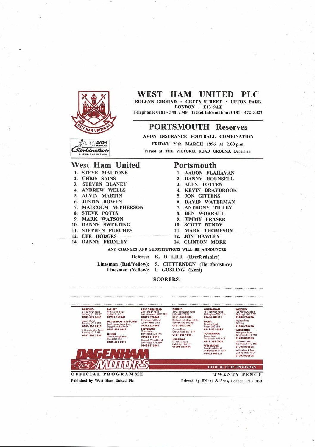 West Ham United v Portsmouth Football Combination Programme 1995/96