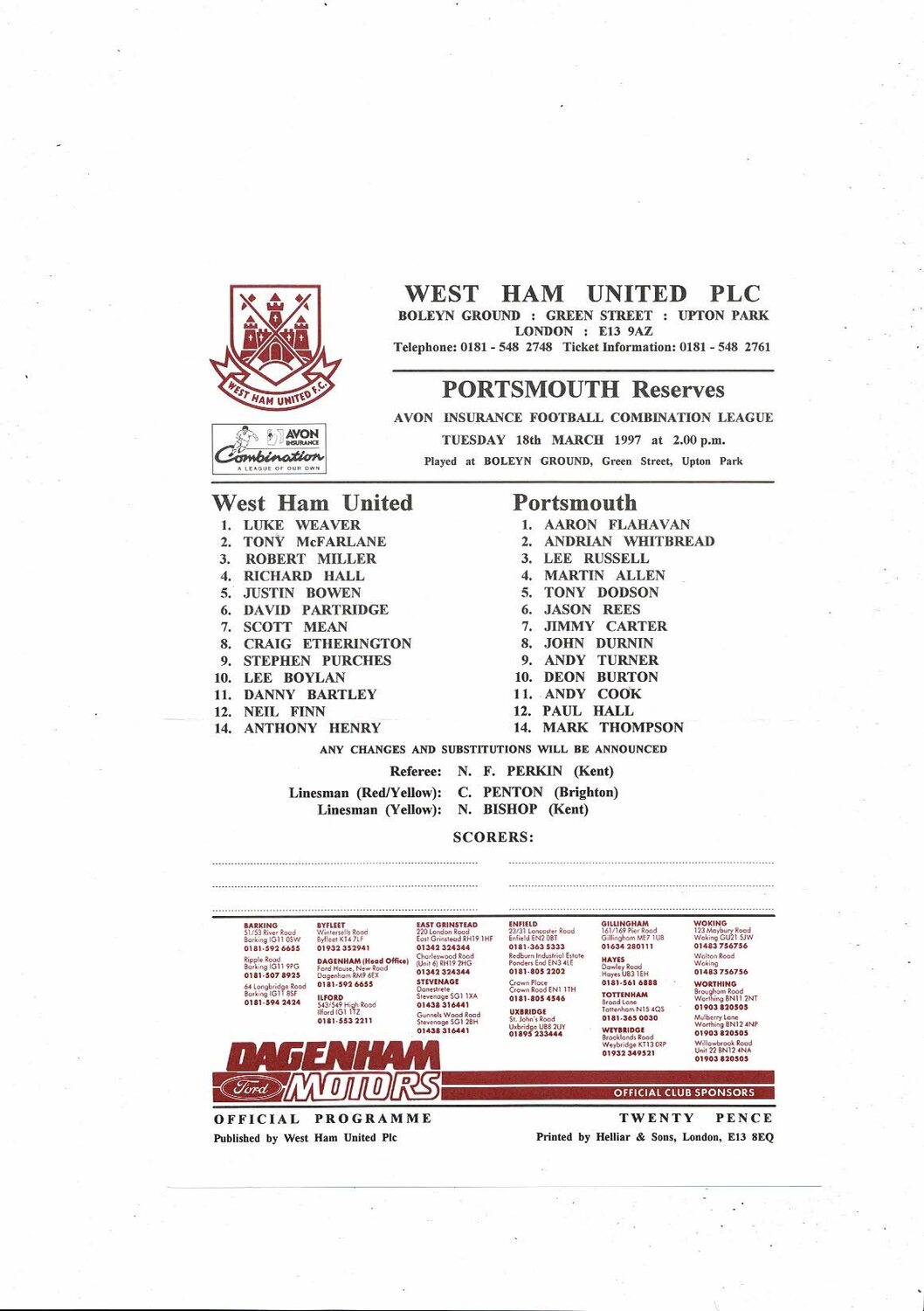 West Ham United v Portsmouth Football Combination Programme 1996/97