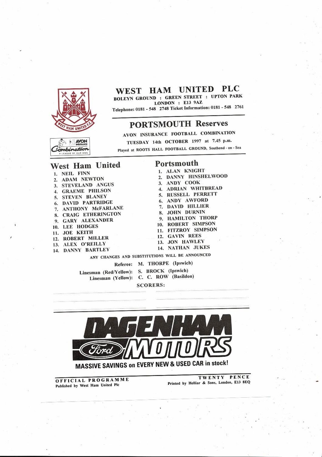 West Ham United v Portsmouth Football Combination Programme 1997/98