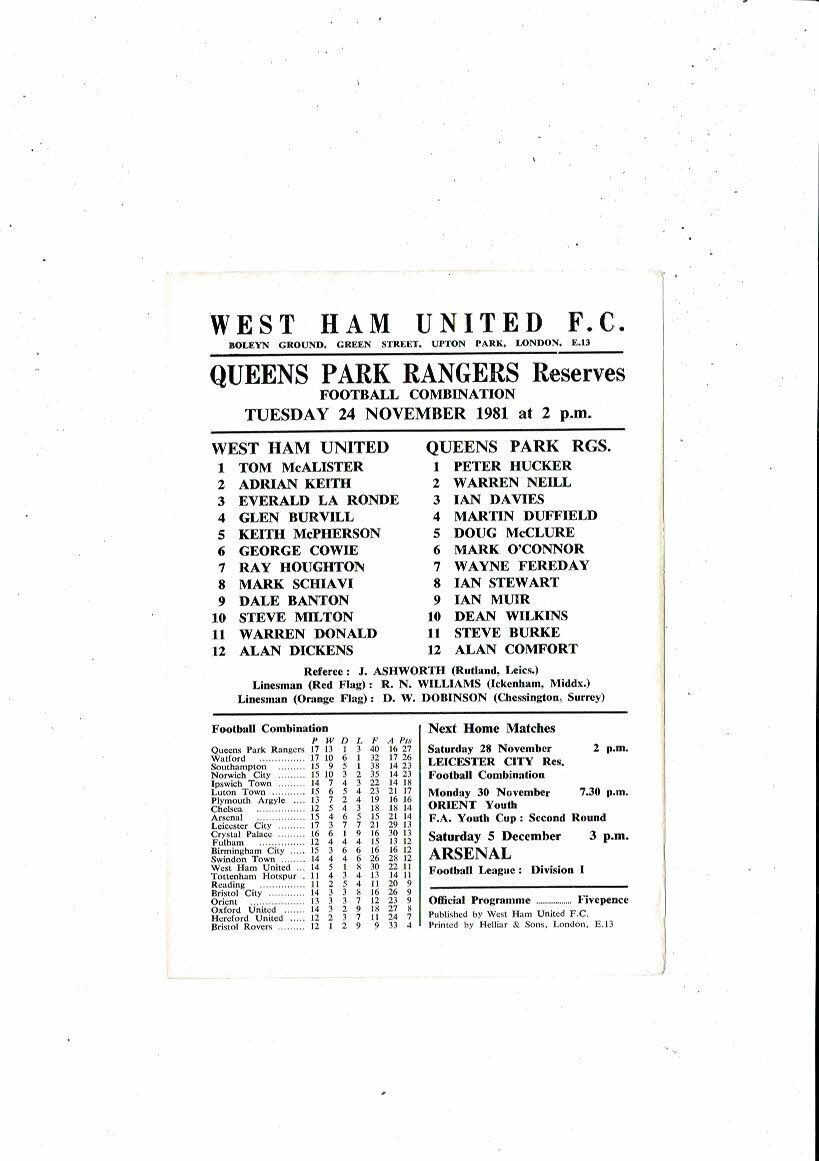 West Ham United v Queens Park Rangers Football Combination Programme 1981/82