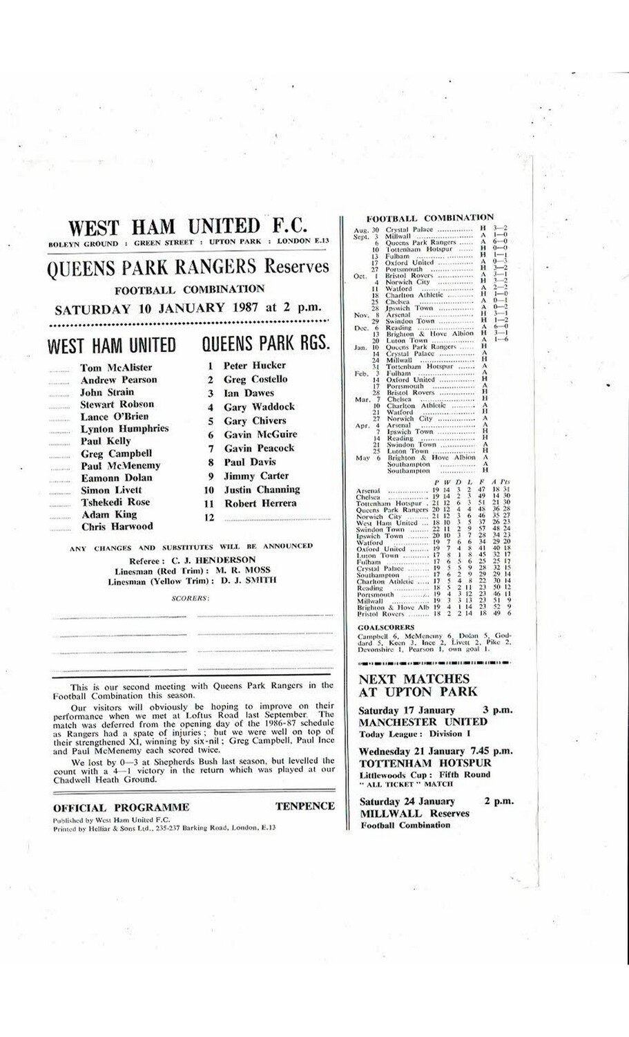 West Ham United v Queens Park Rangers Football Combination Programme 1986/87