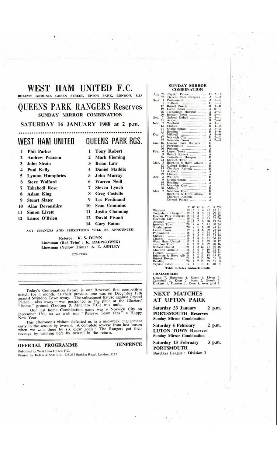 West Ham United v Queens Park Rangers Football Combination Programme 1987/88