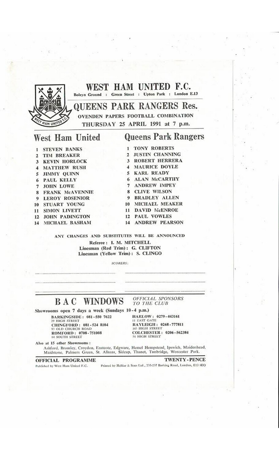 West Ham United v Queens Park Rangers Football Combination Programme 1990/91