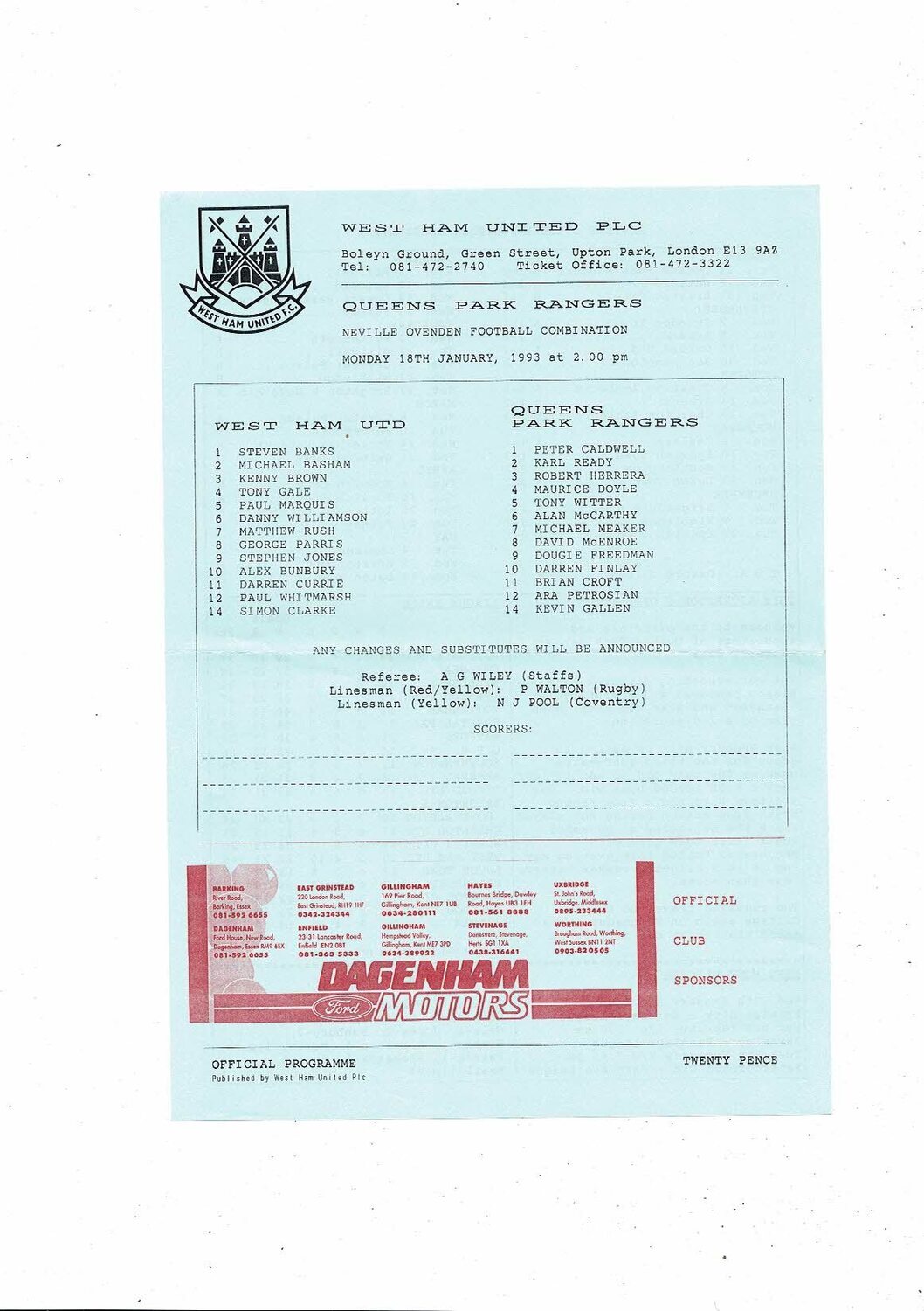 West Ham United v Queens Park Rangers Football Combination Programme 1992/93