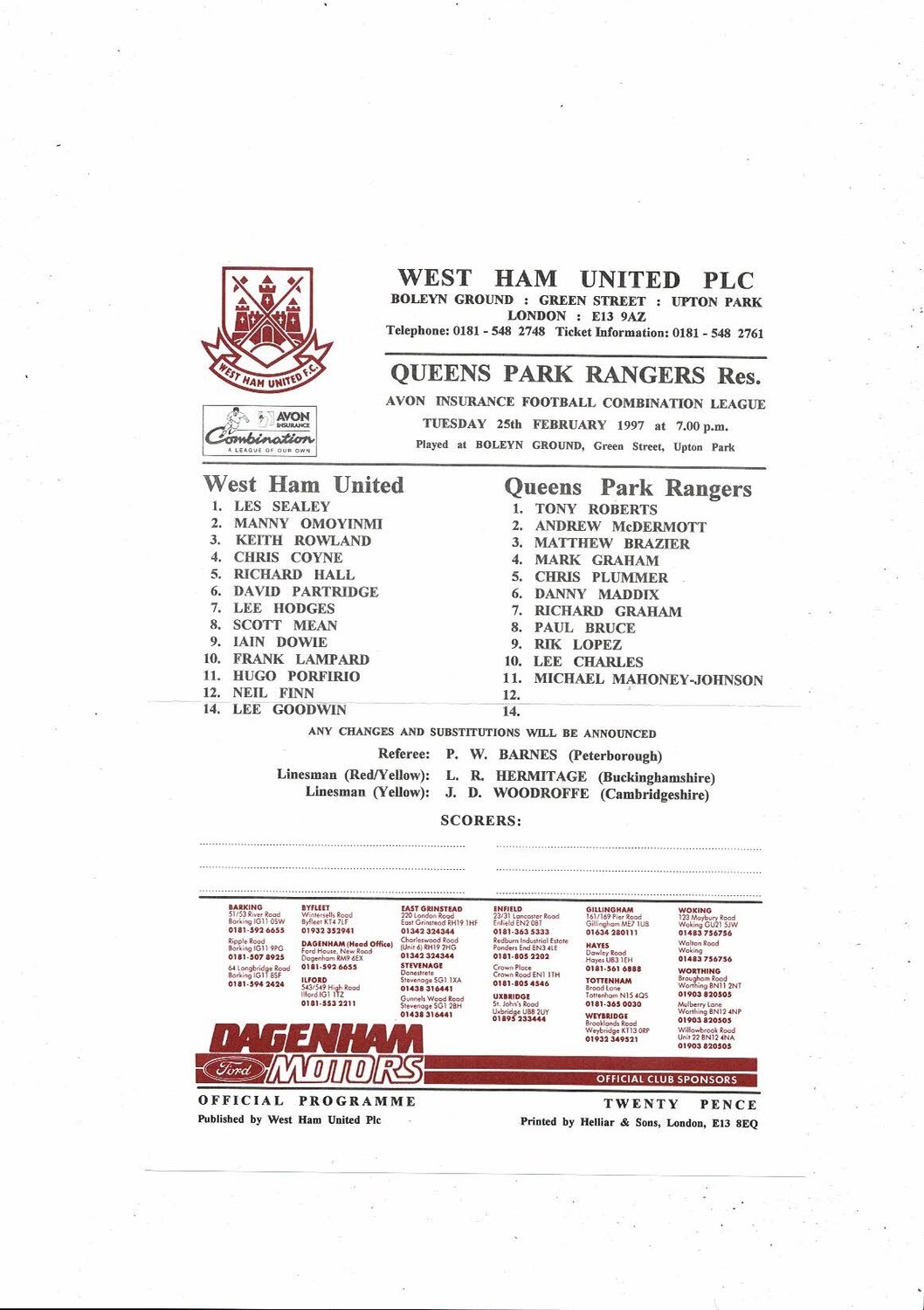 West Ham United v Queens Park Rangers Football Combination Programme 1996/97