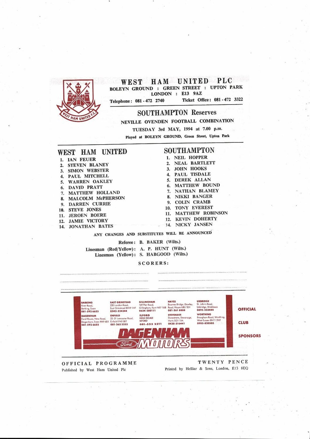 West Ham United v Southampton Football Combination Programme 1993/94