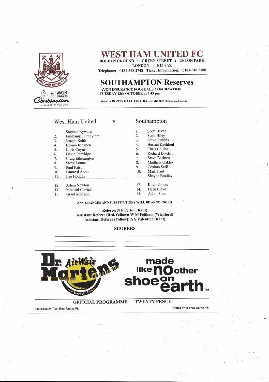 West Ham United v Southampton Football Combination Programme 1998/99