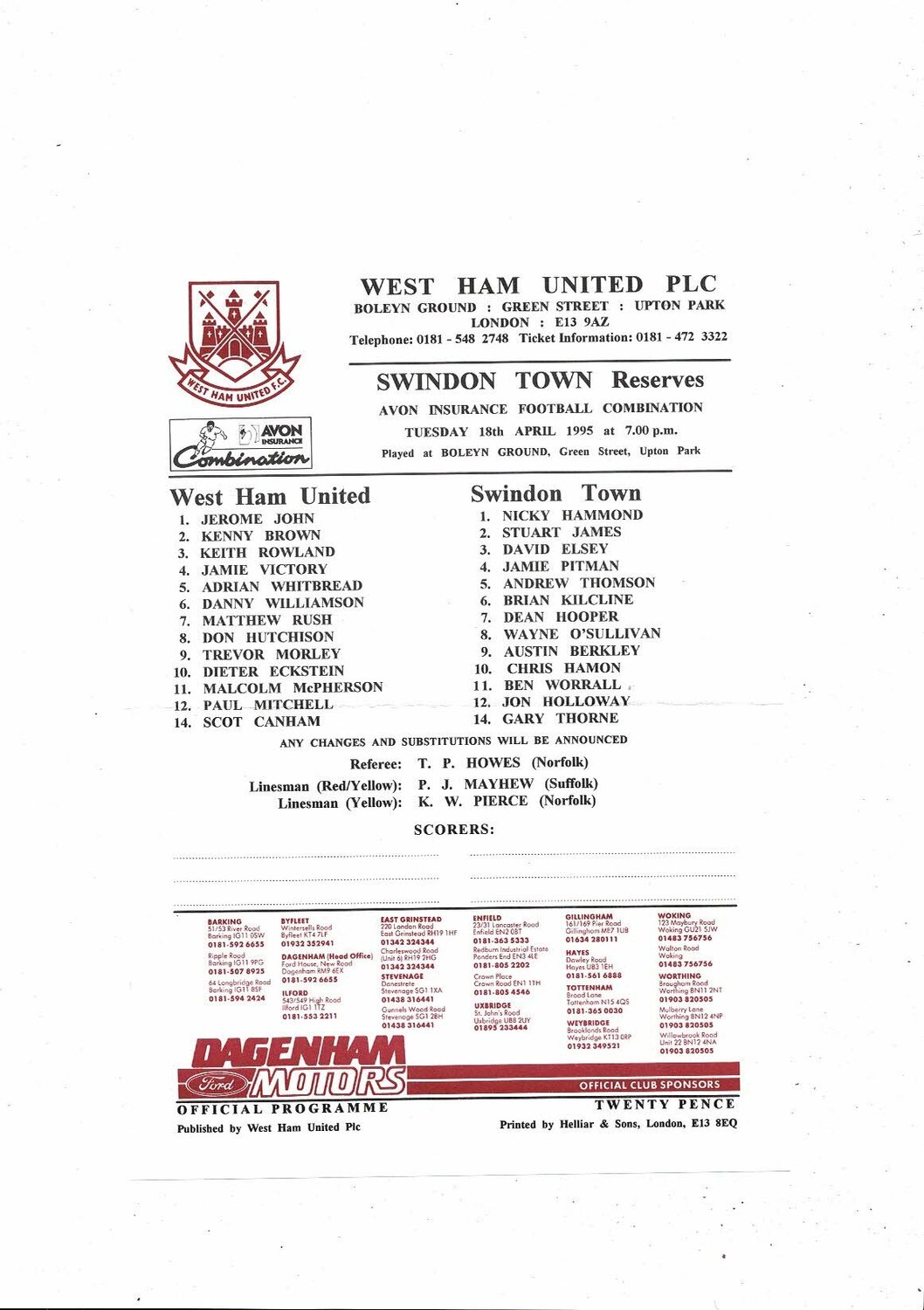 West Ham United v Swindon Town Football Combination Programme 1994/95