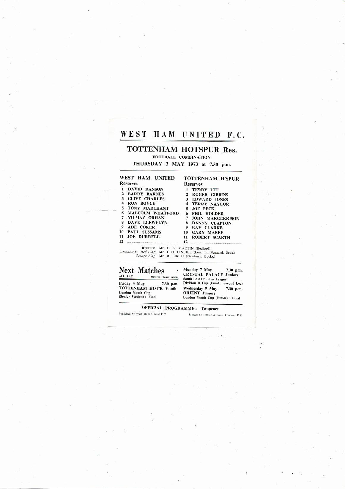 West Ham United v Tottenham Hotspur Football Combination Programme 1972/73