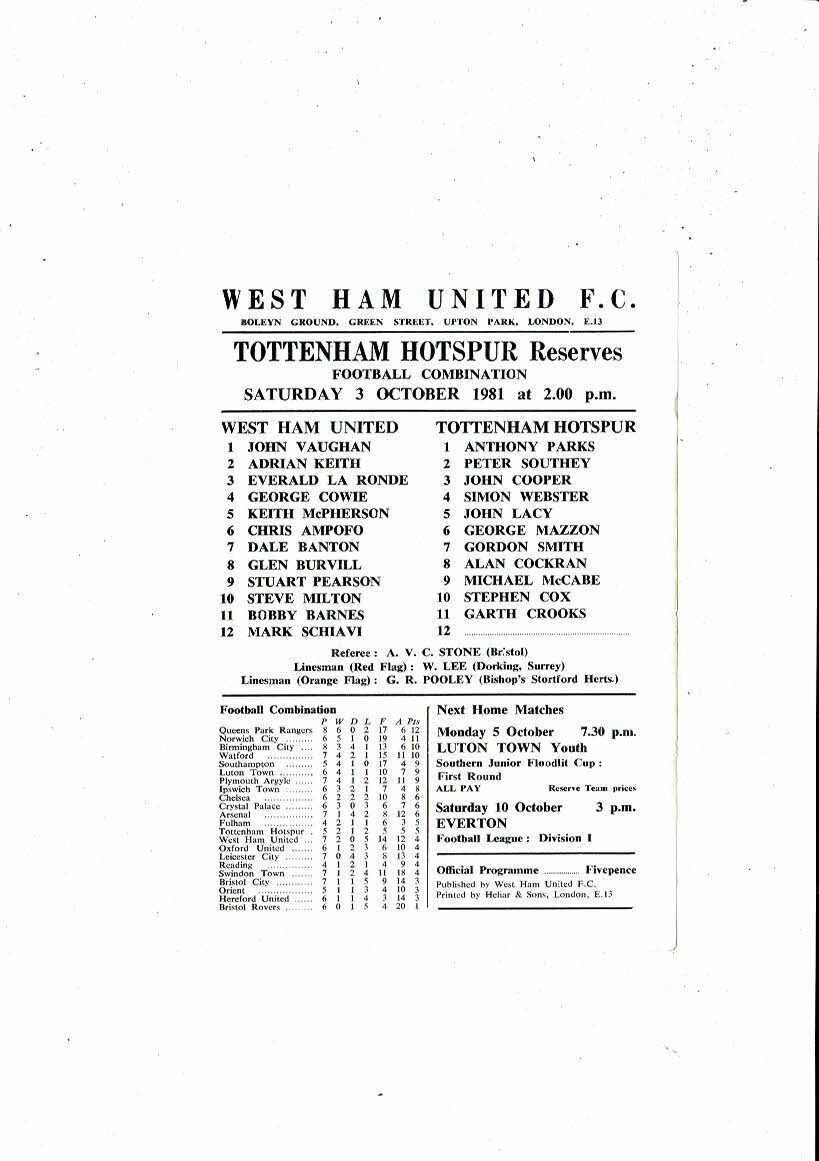 West Ham United v Tottenham Hotspur Football Combination Programme 1981/82