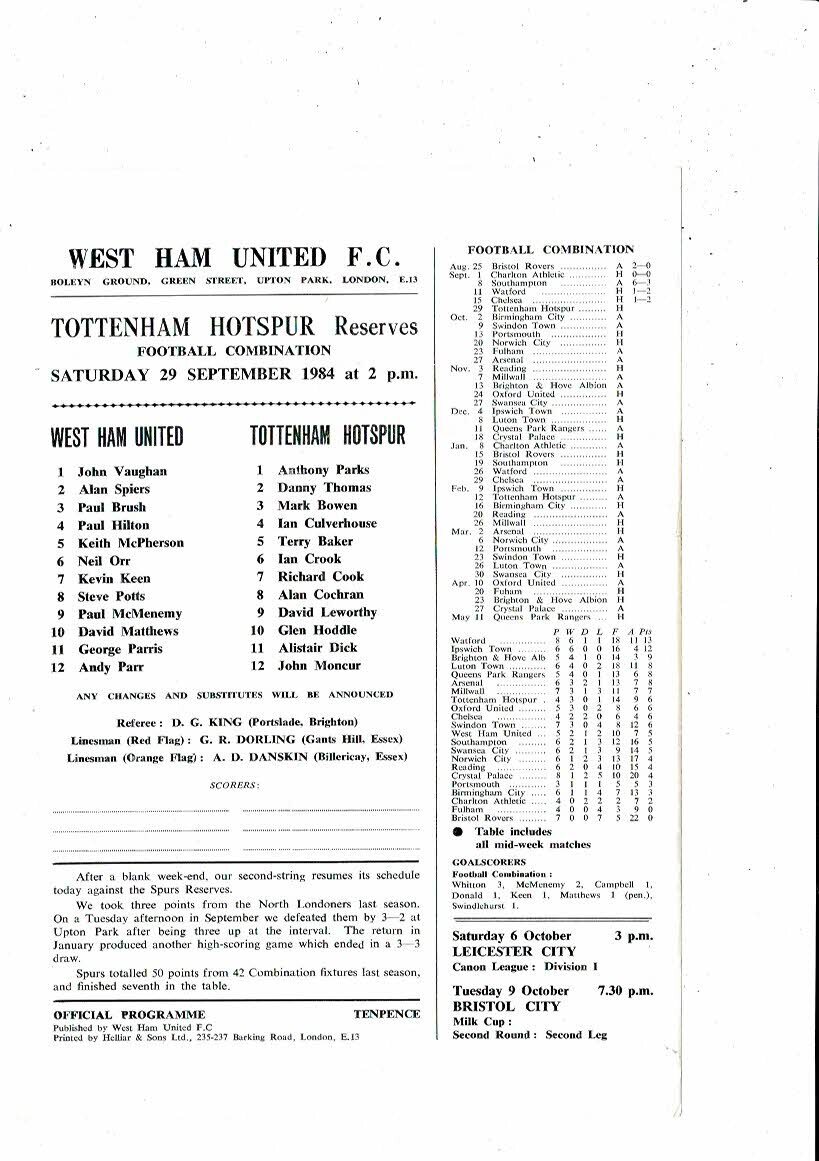 West Ham United v Tottenham Hotspur Football Combination Programme 1984/85