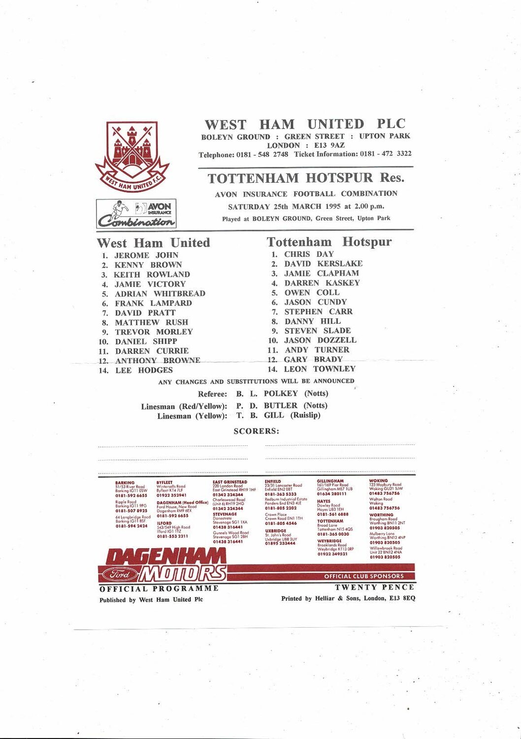 West Ham United v Tottenham Hotspur Football Combination Programme 1994/95