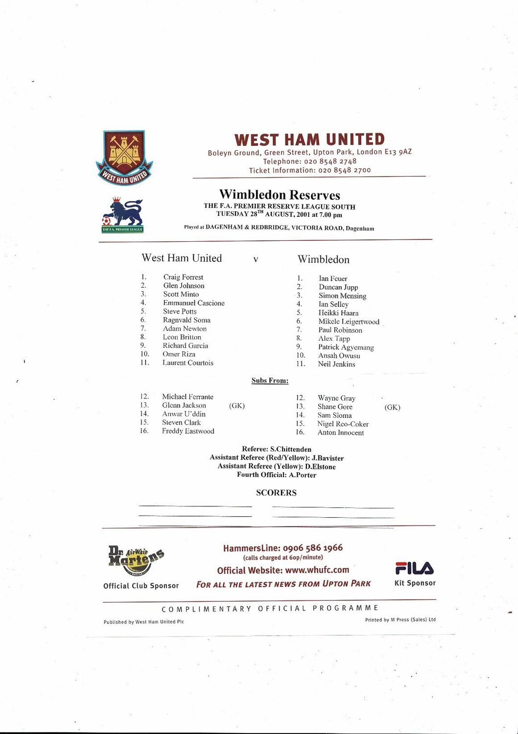 West Ham United v Wimbledon Football Combination Programme 2000/01