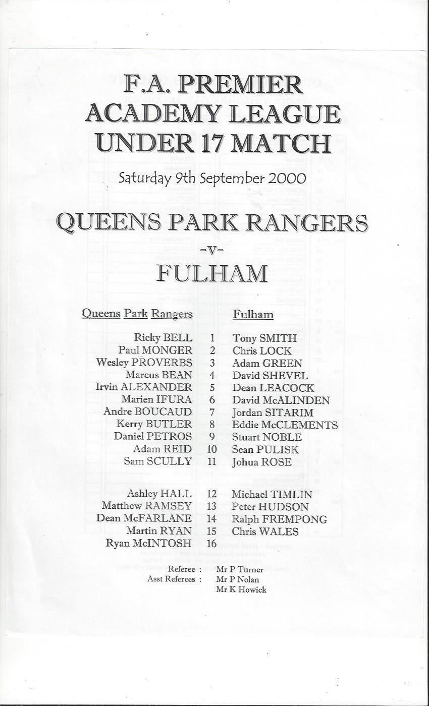 Queens Park Rangers v Fulham U17 League Football Programme 2000/01