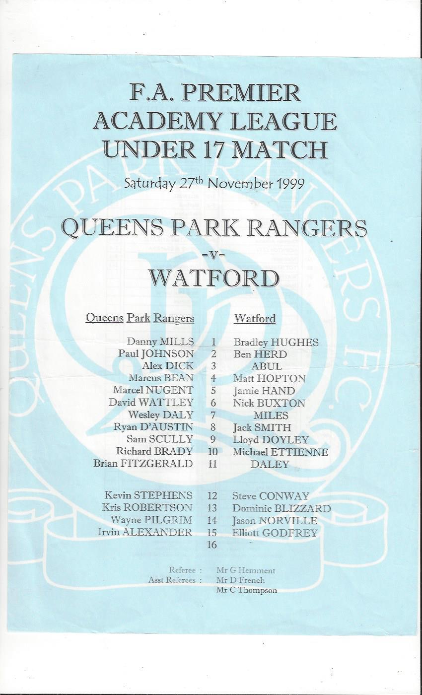 Queens Park Rangers v Watford U17 League Football Programme 1999/00