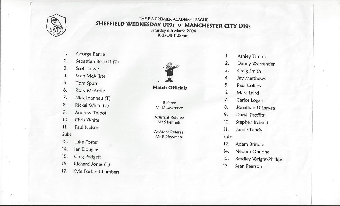 Sheffield Wednesday v Manchester City U19 Football Programme 2003/04