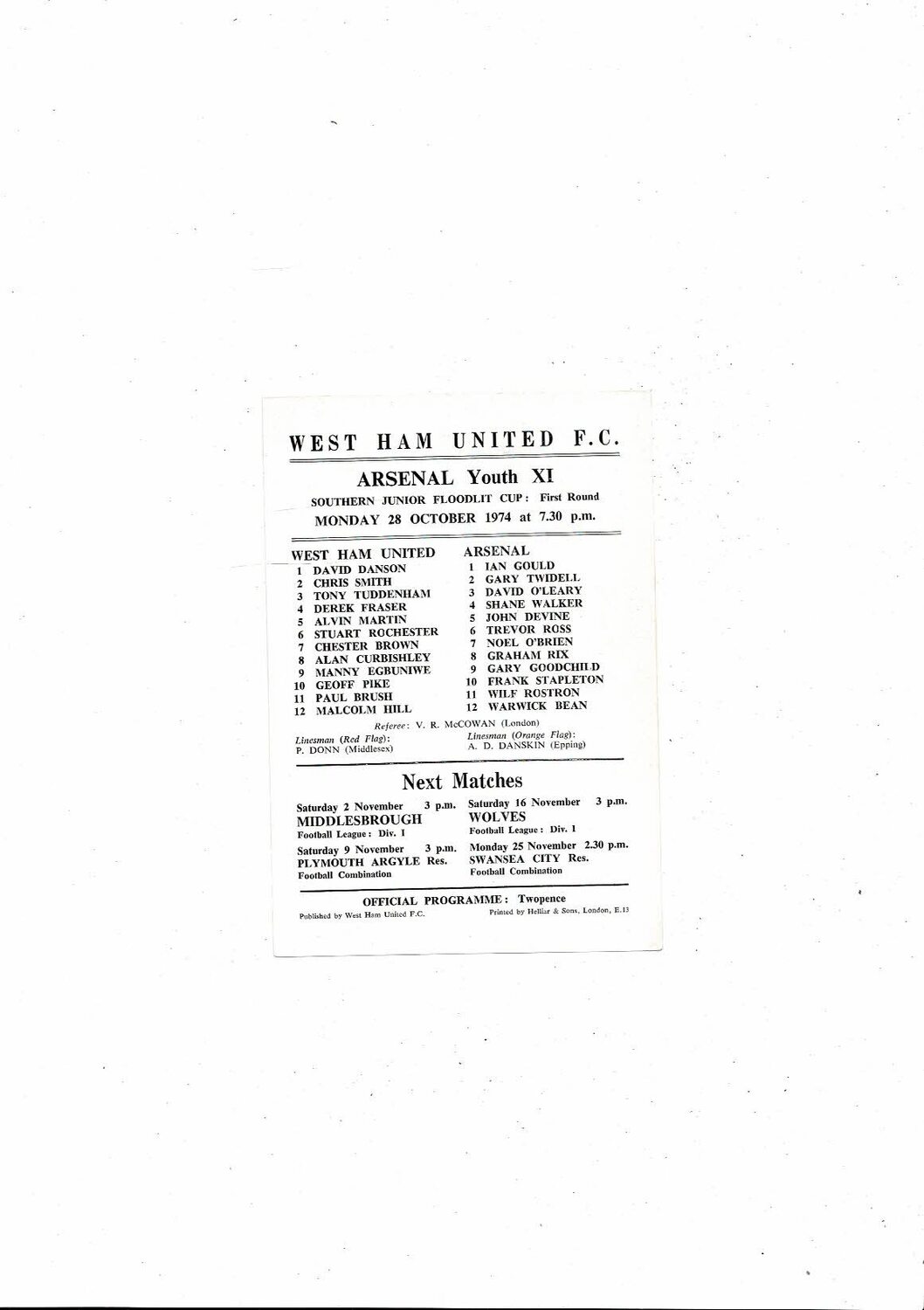 West Ham United v Arsenal Southern Jnr Floodlit Cup Football Programme 1974/75