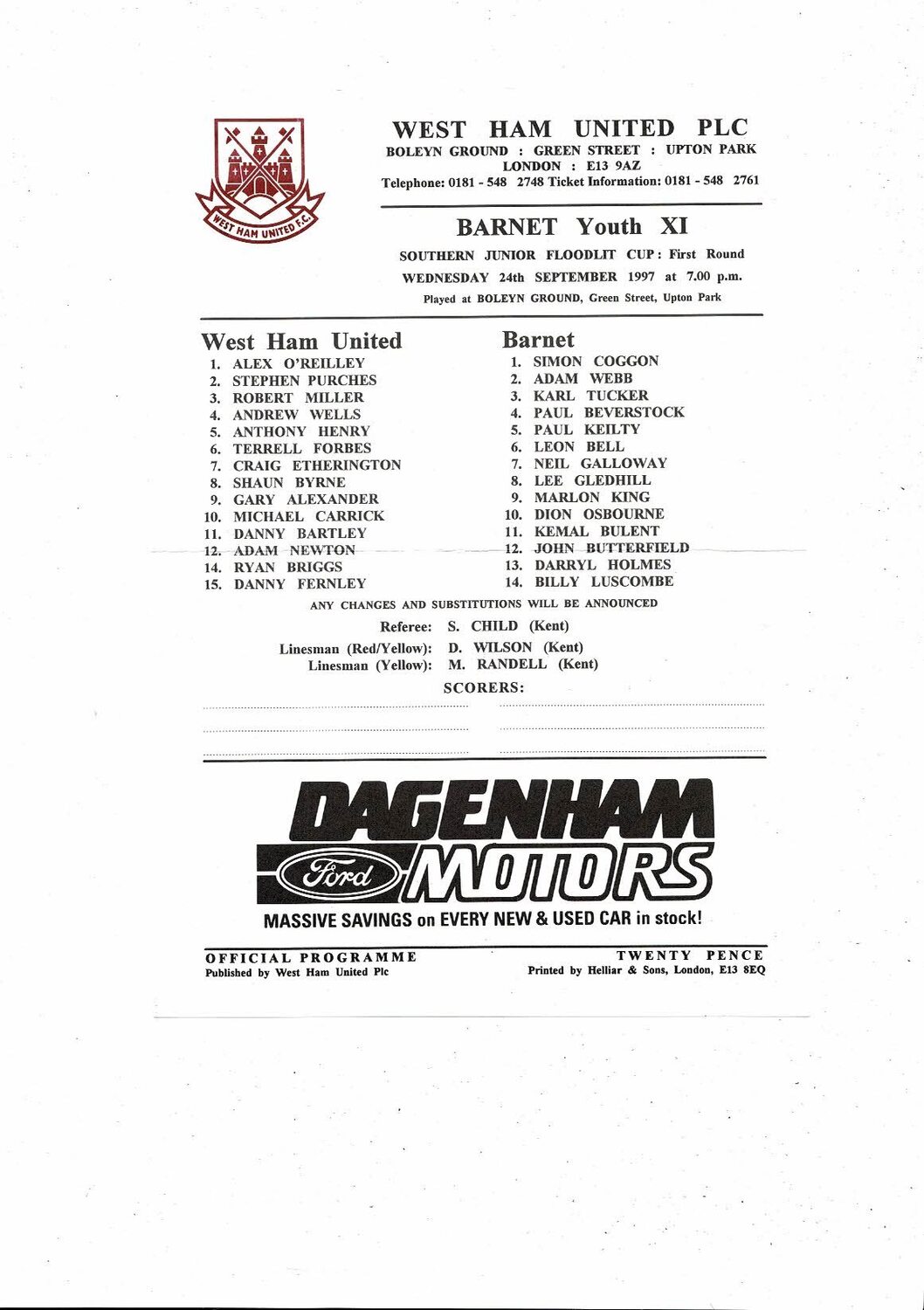 West Ham United v Barnet Southern Junior Cup Football Programme 1997/98