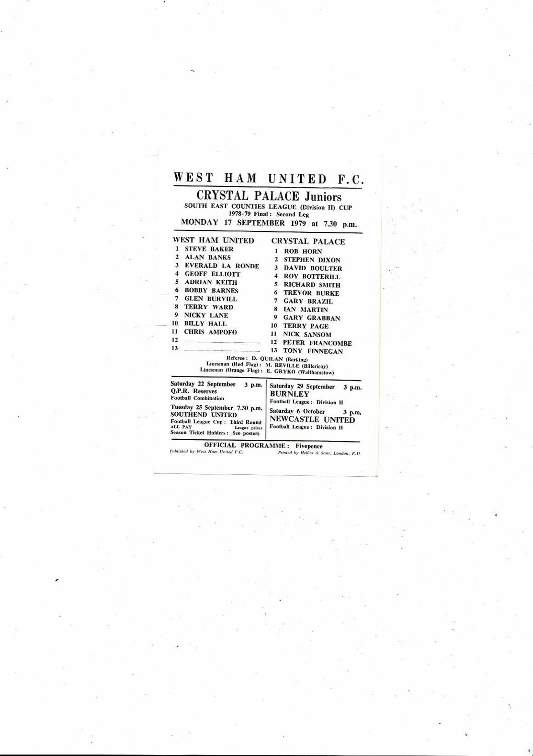 West Ham United v Crystal Palace SEC League Cup Final Football Programme 1979/80