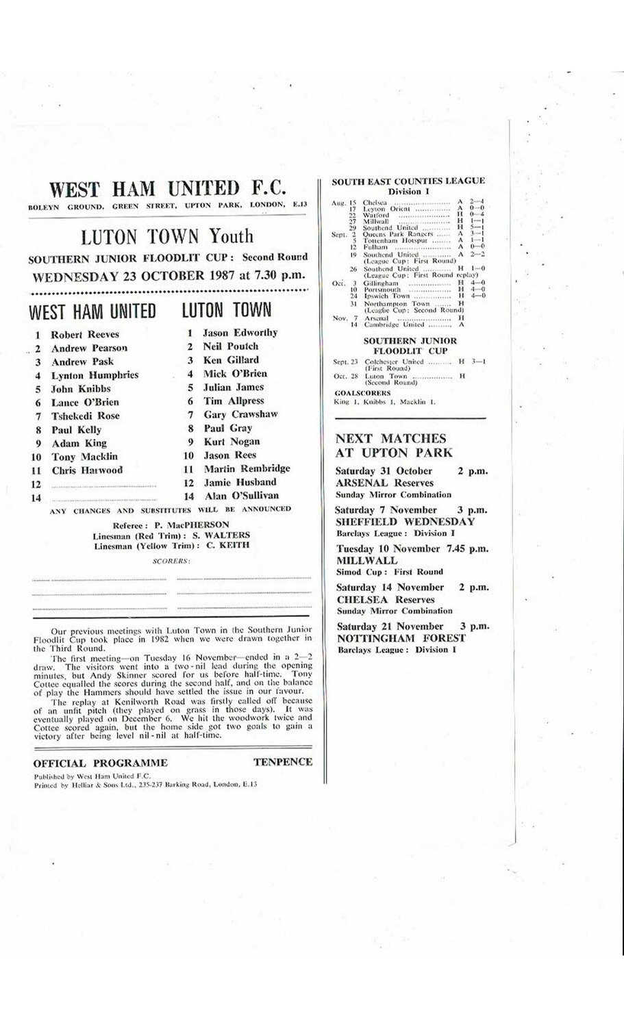 West Ham United v Luton Town Southern Junior Cup Football Programme 1987/88