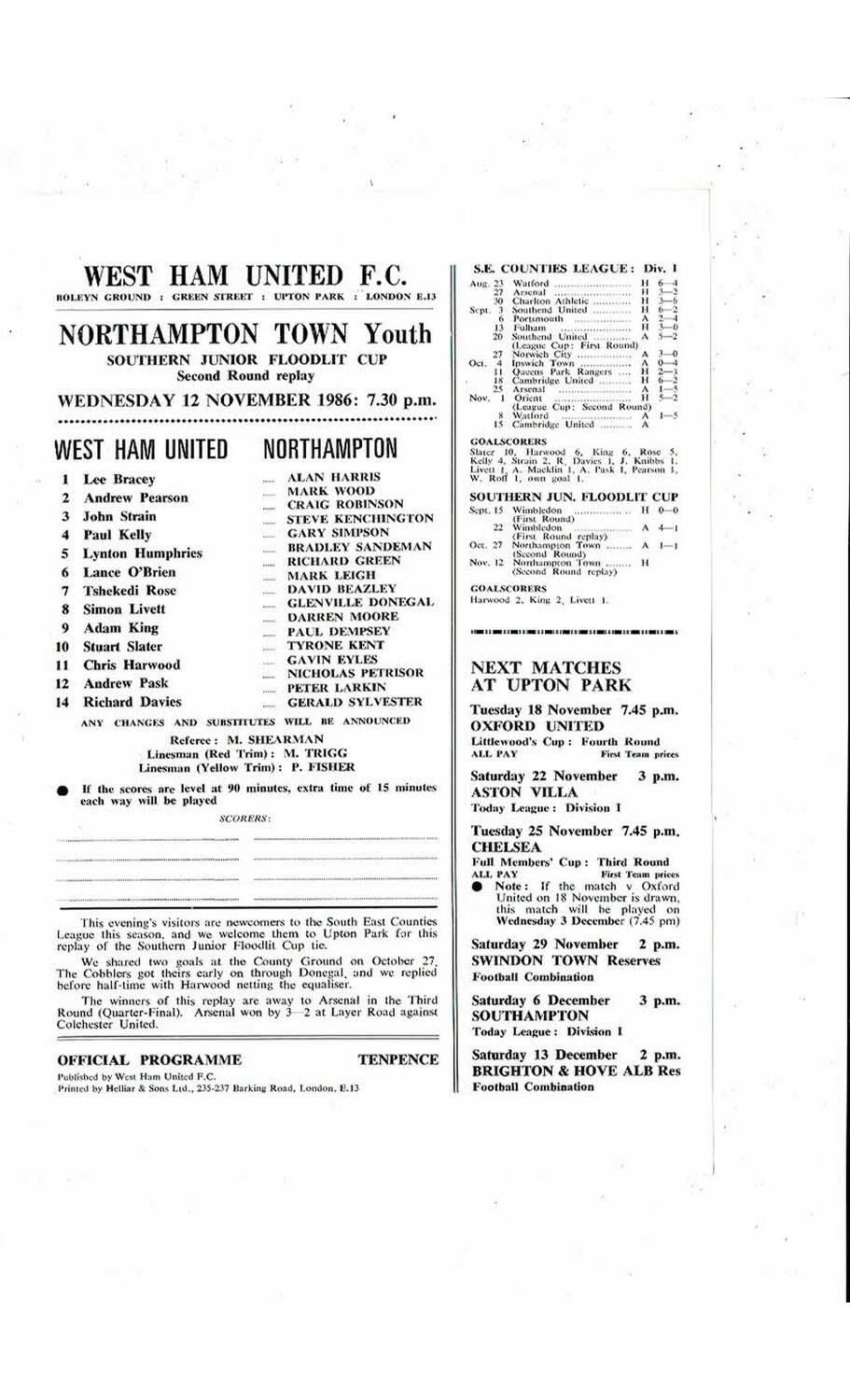 West Ham United v Northampton Town Southern Junior Floodlit Cup Football Programme 1986/87