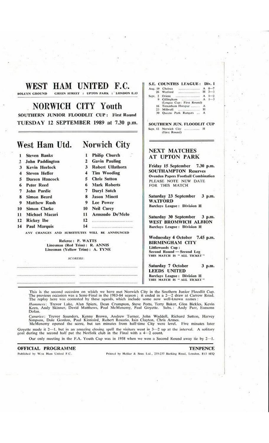 West Ham United v Norwich City Southern Junior Floodlit Cup Football Programme 1989/90