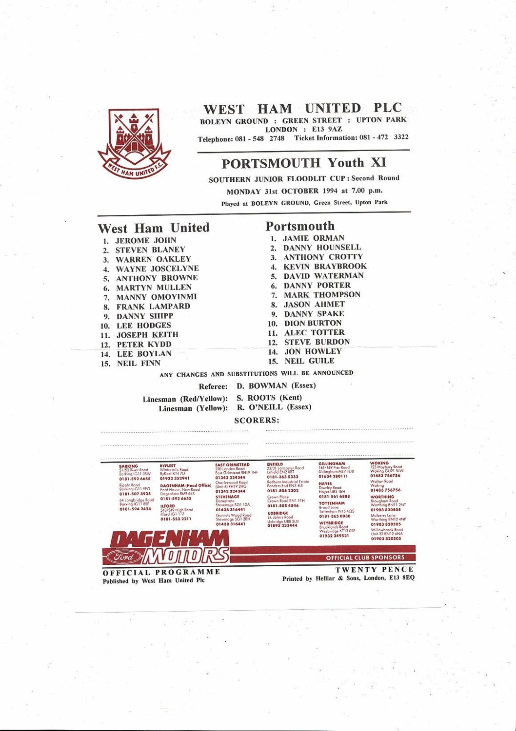 West Ham United v Portsmouth Southern Junior Cup Football Programme 1994/95