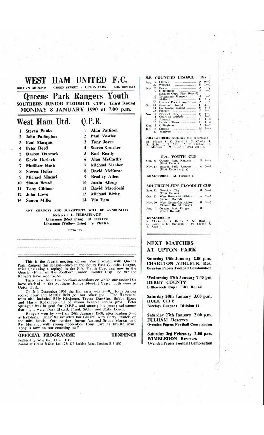 West Ham United v Queens Park Rangers Southern Junior Floodlit Cup Football Programme 1989/90