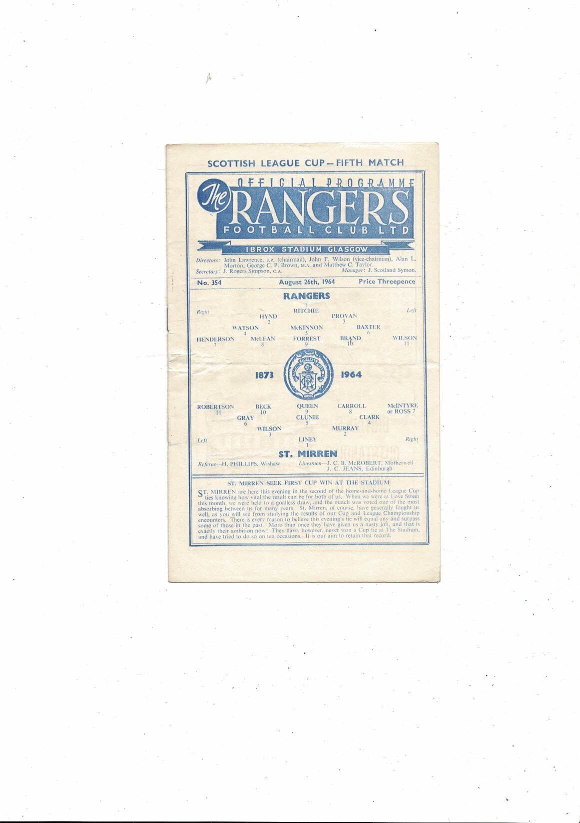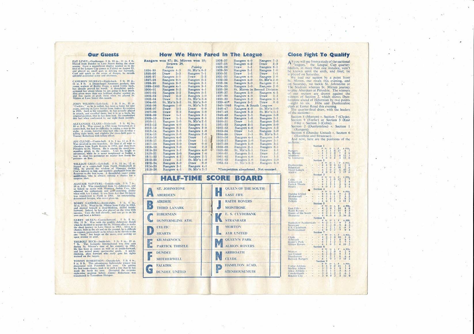 1964/65 Rangers v St Mirren League Cup Football Programme