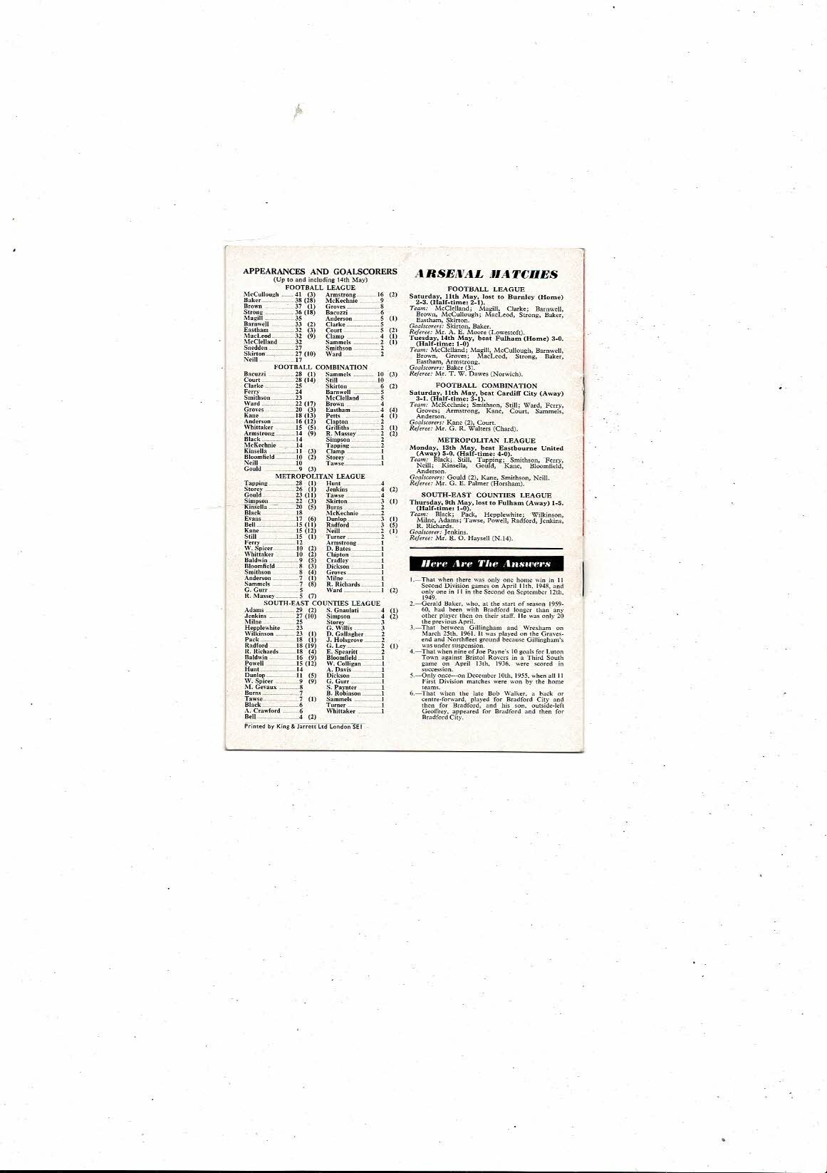 Arsenal v Rangers Jack Kelsey Testimonial Football Programmes 1962/63