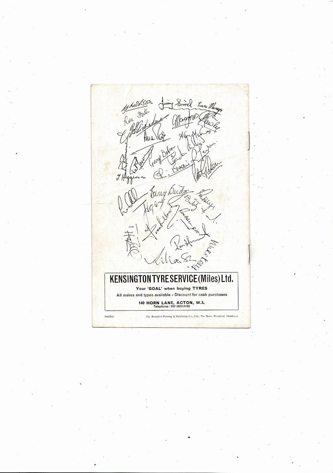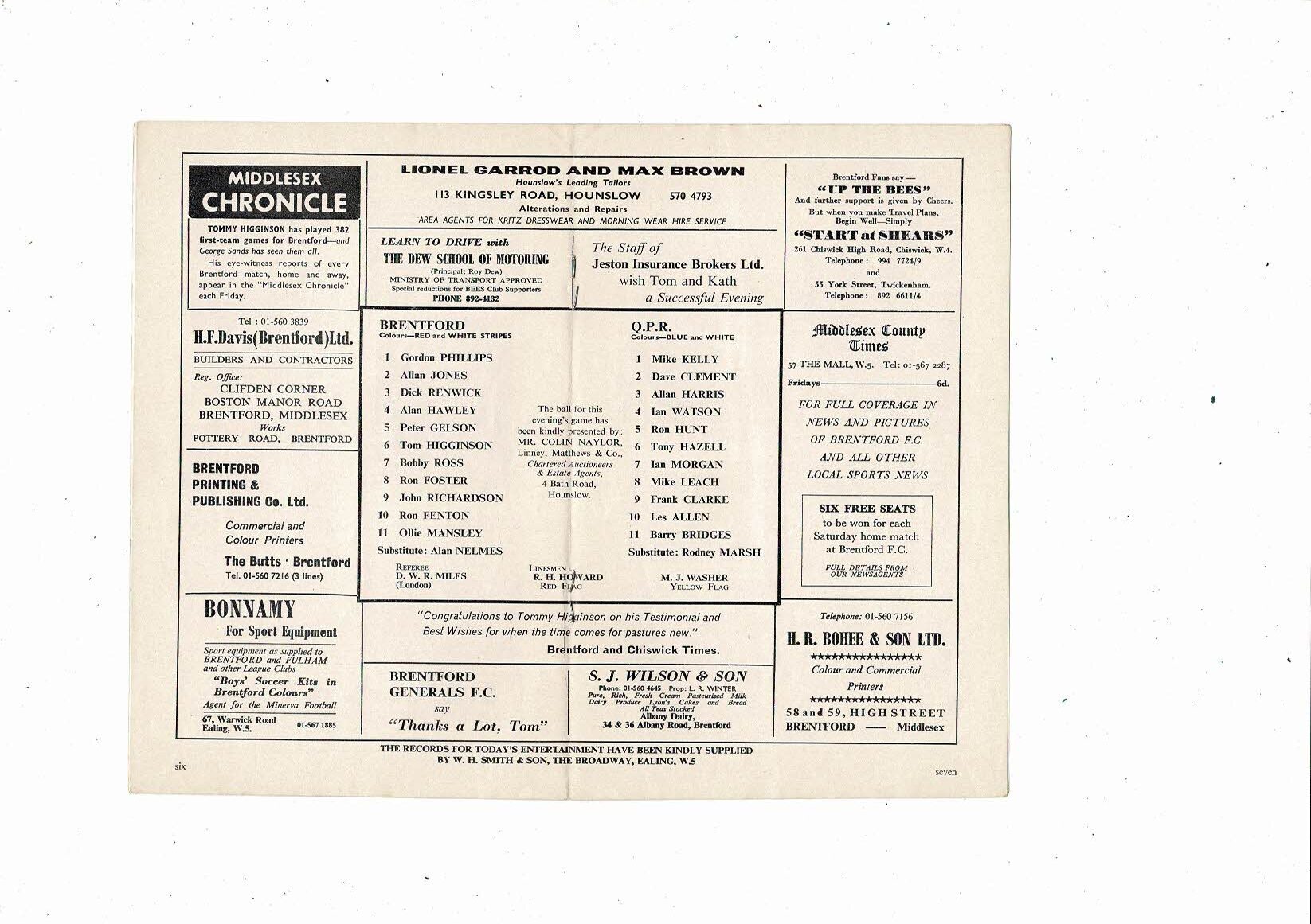 Brentford v Queens Park Rangers Tom Higginson Testimonial Football Programme 1968/69