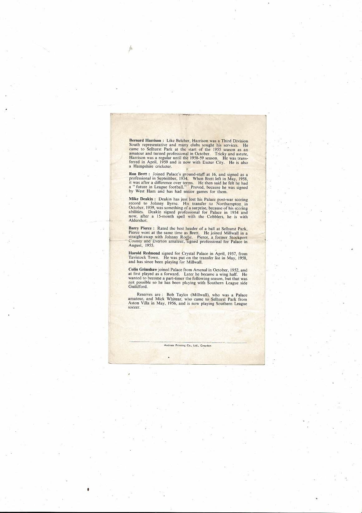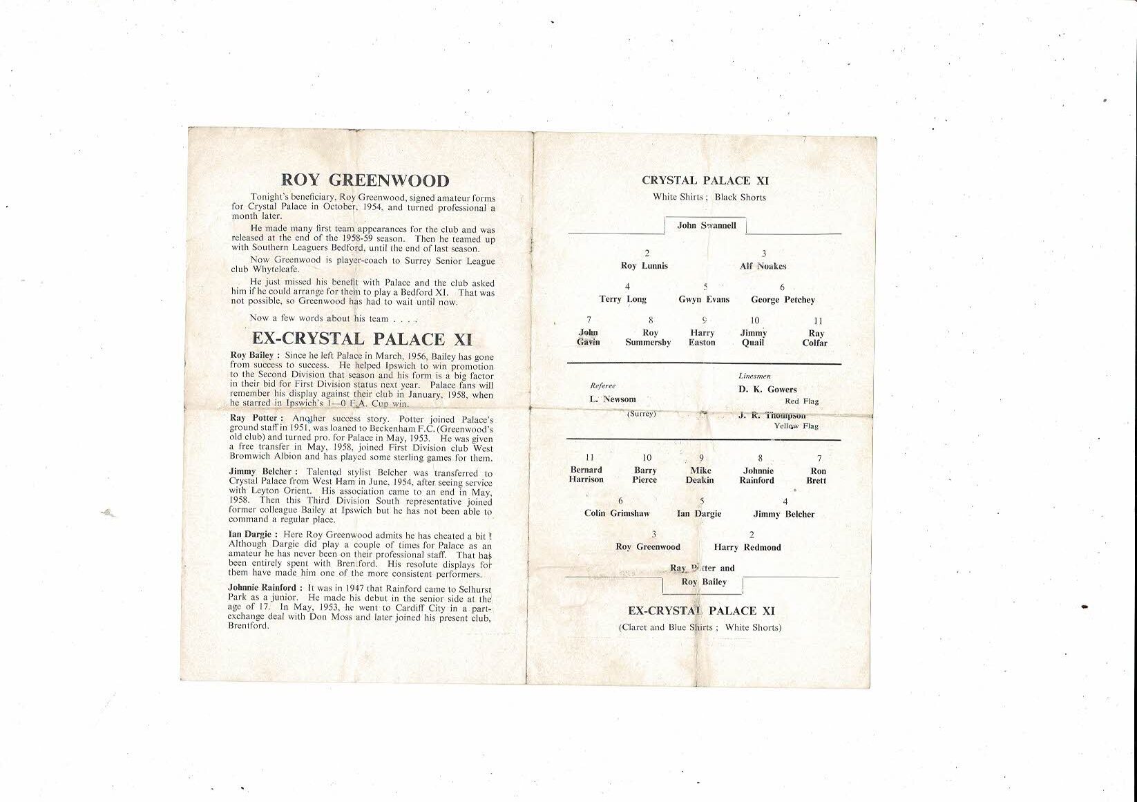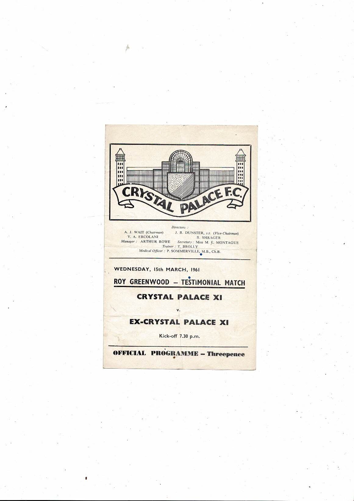 Crystal Palace v Ex Crystal Palace Roy Greenwood Testimonial Programme 1960/61