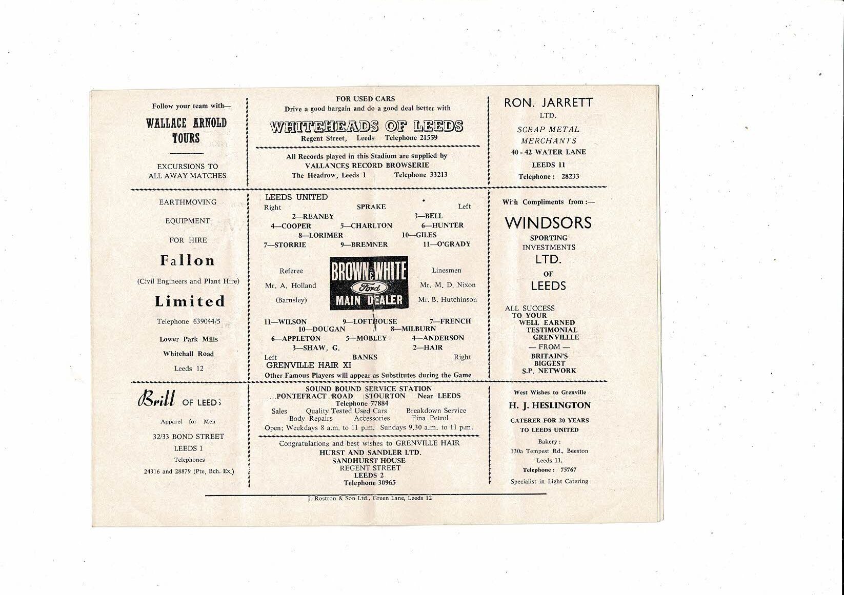 Leeds United v Grenville Hair X1 Testimonial Football Programme 1965/66