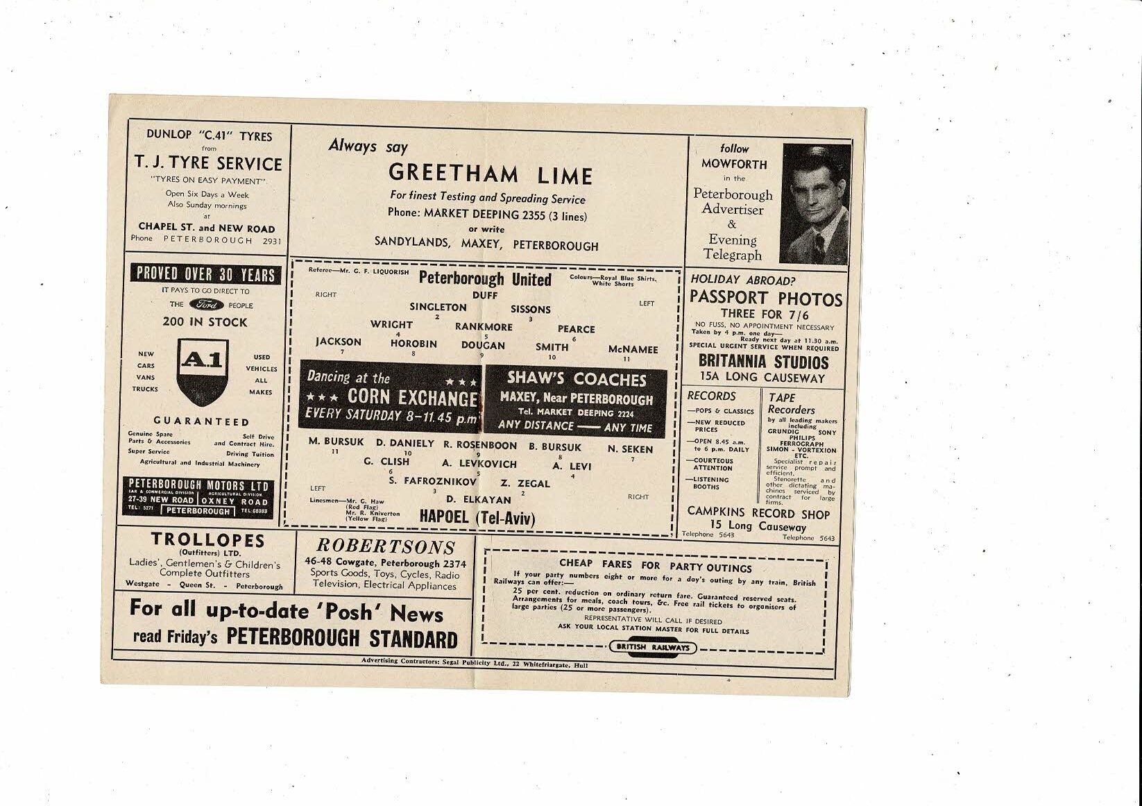 Peterborough United v Hapoel Testimonial Fund Football Programme 1963/64
