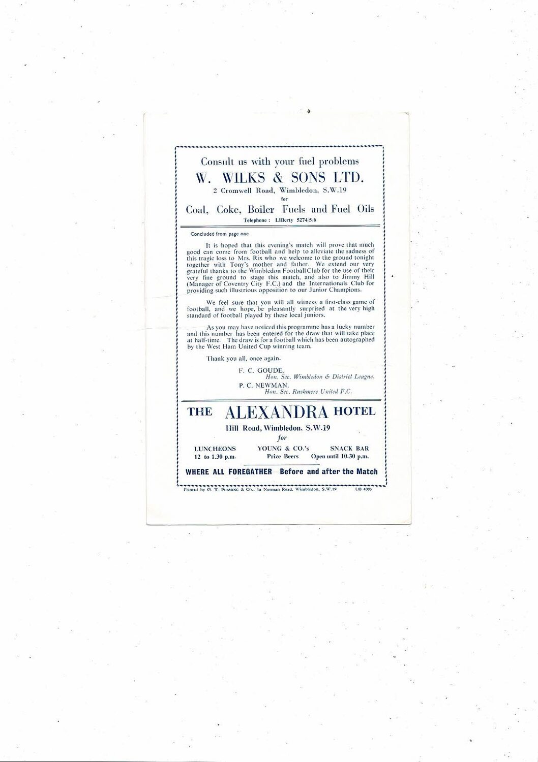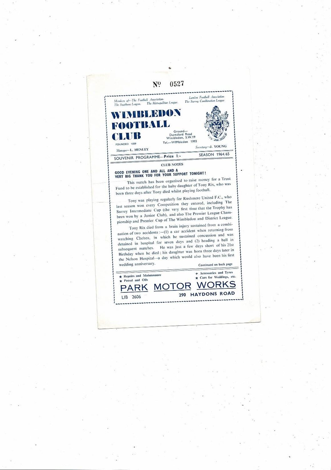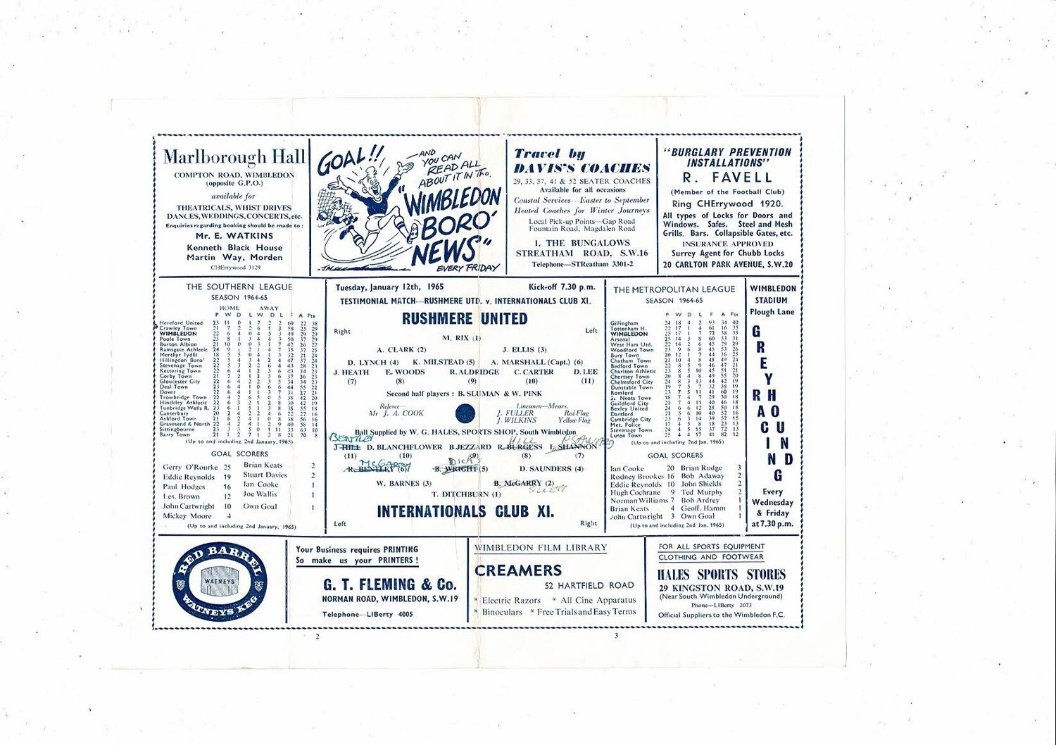 Rushmere United v International Club X1 Testimonial Programme @ Wimbledon 1964/65