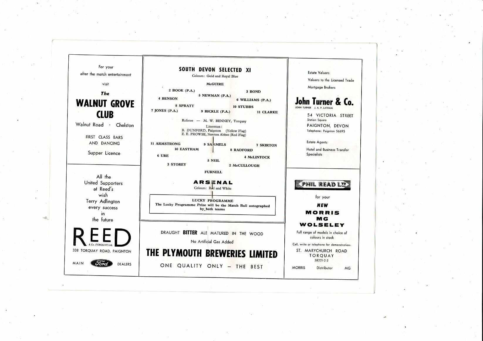 South Devon Select v Arsenal Terry Adlington Testimonial Football Programme 1965/66