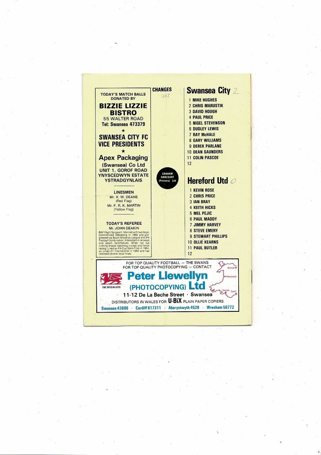 1984/85 Swansea v Hereford United Welsh Cup Football Programme