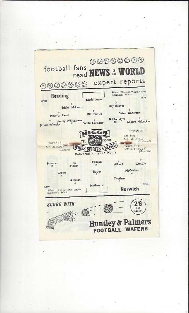 1958/59 Reading v Norwich City Football Programme