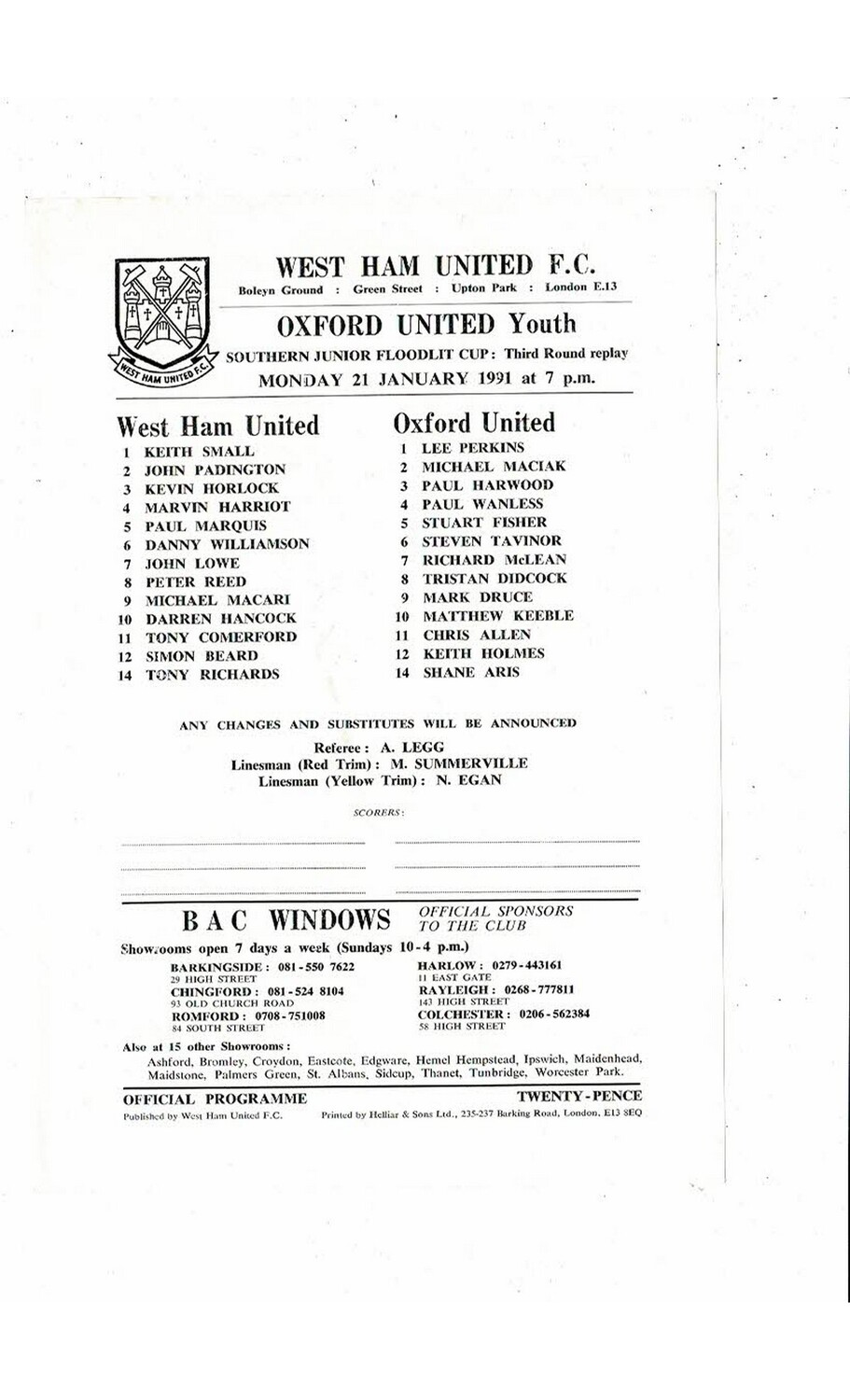 West Ham United v Oxford United Youth Cup 3rd Rd Rep Football Programme 1990/91