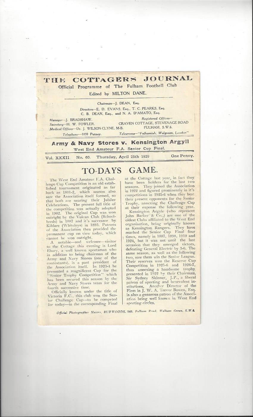 1928/29 Army & Navy Stores v Kensington Argyll West End Cup Final Programme