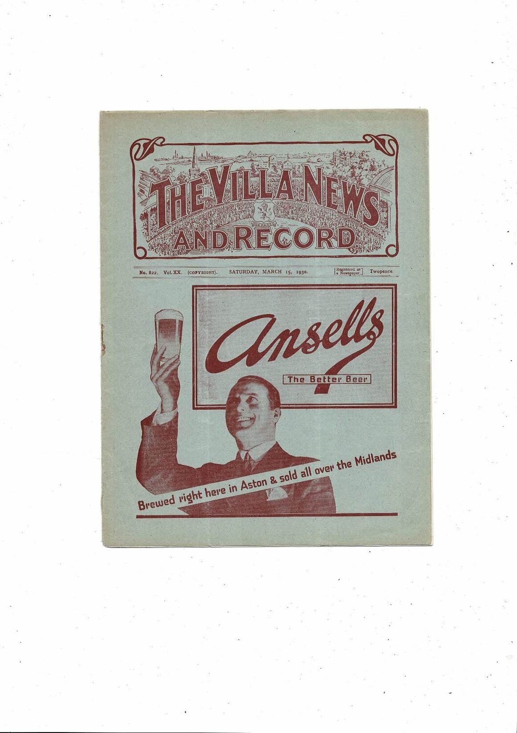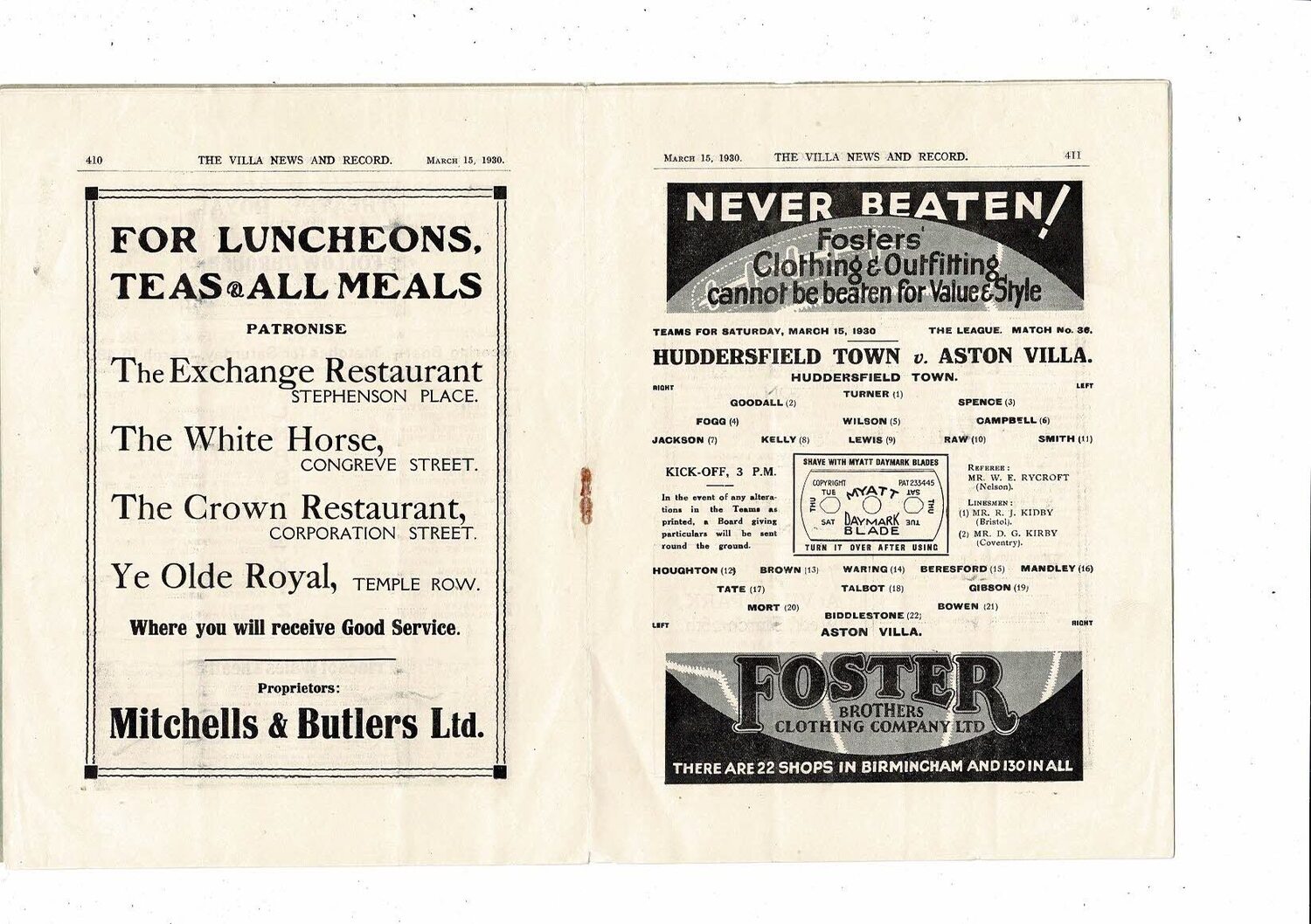 1929/30 Aston Villa v Huddersfield Town Football Programme