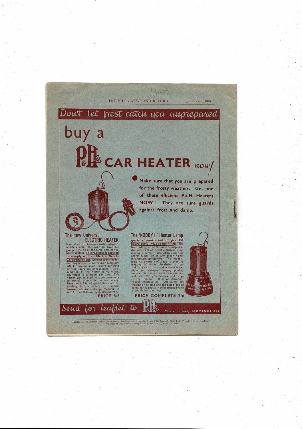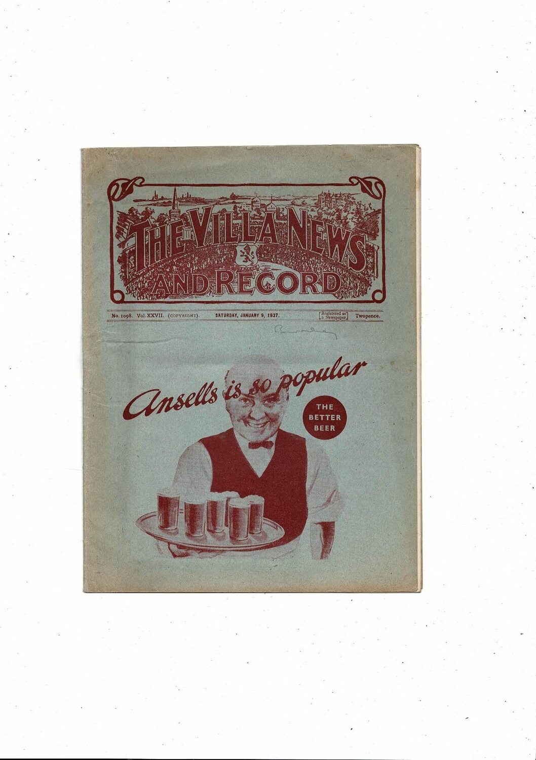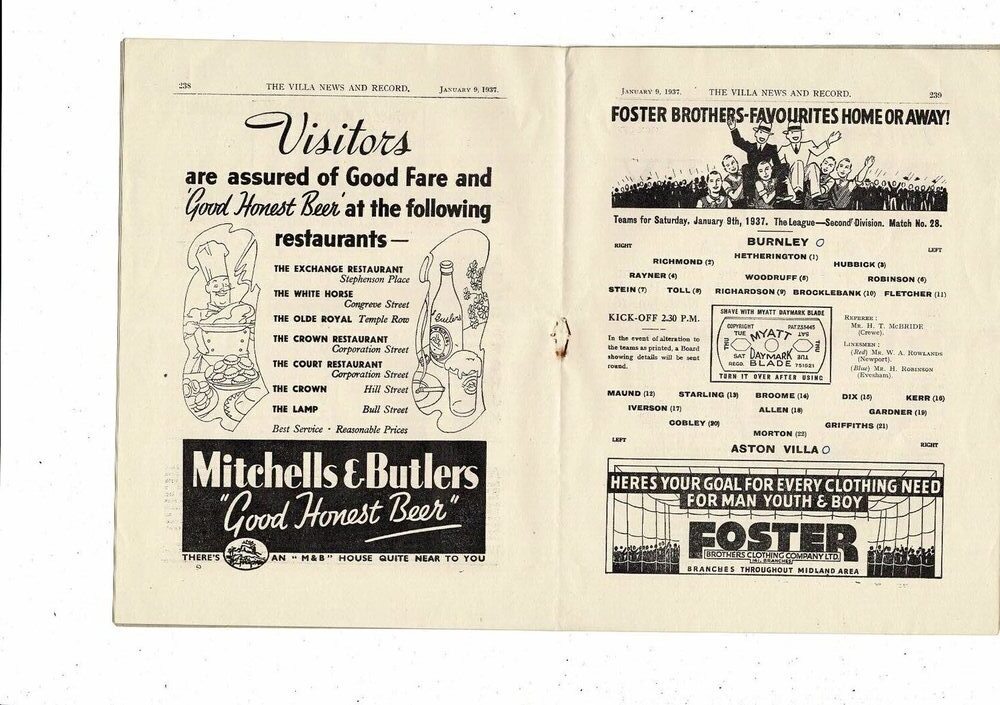 1936/37 Aston Villa v Burnley Football Programme Jan 9th