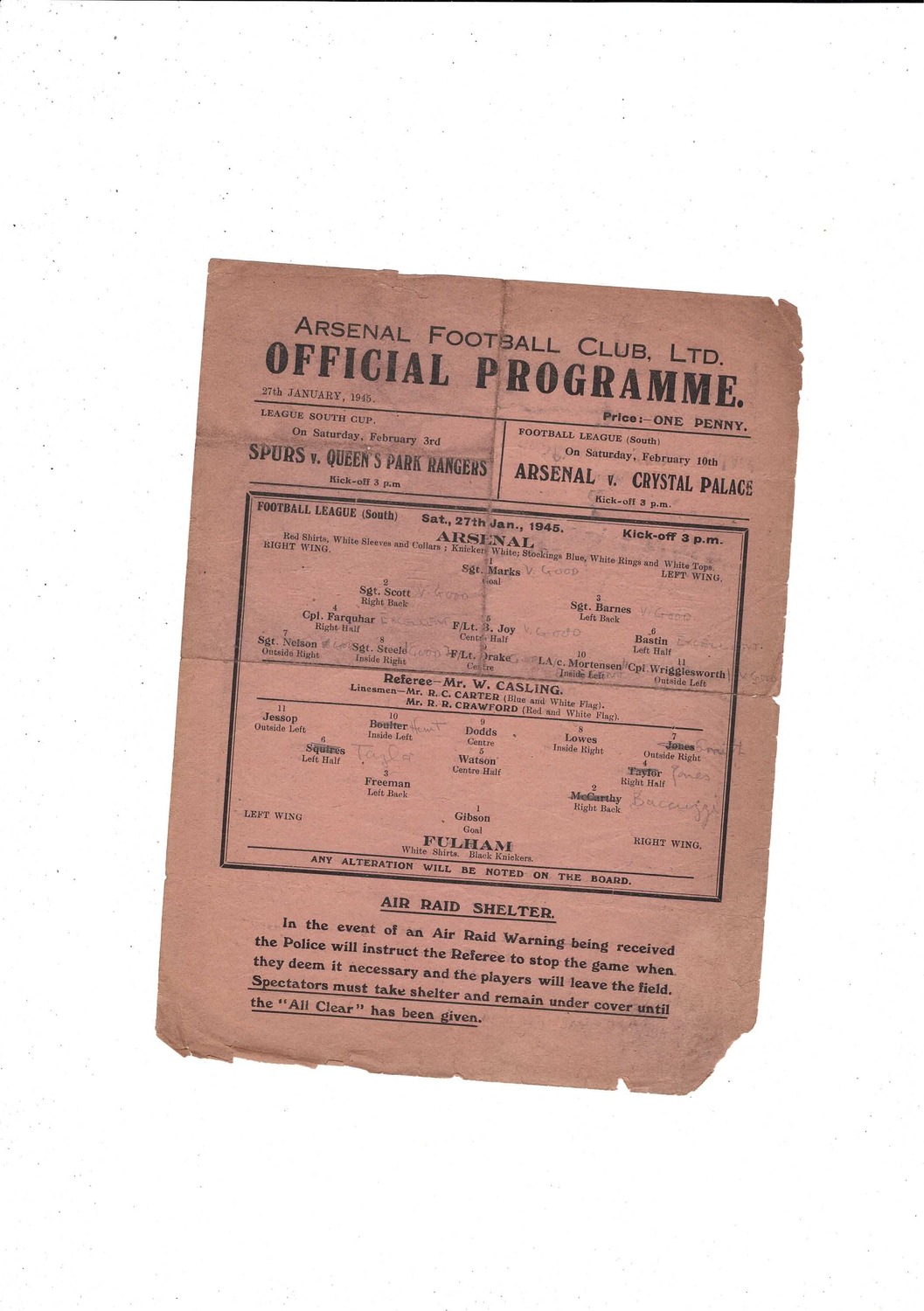 This original single sheet Football Programme is creased & folded with some staining, several small tears, corner pieces & several small pieces missing with team changes & performance comments in pencil. Please see scans